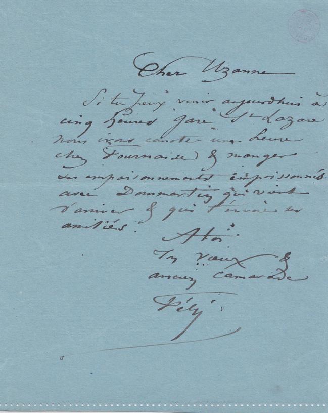 Si tu peux venir aujourdhui à cinq heures Gare St Lazare nous irons canoter une heure chez Fournaise & manger des empoisonnements empoissonnés avec Dommartin qui vient d’arriver & qui t’envoie ses amitiés.