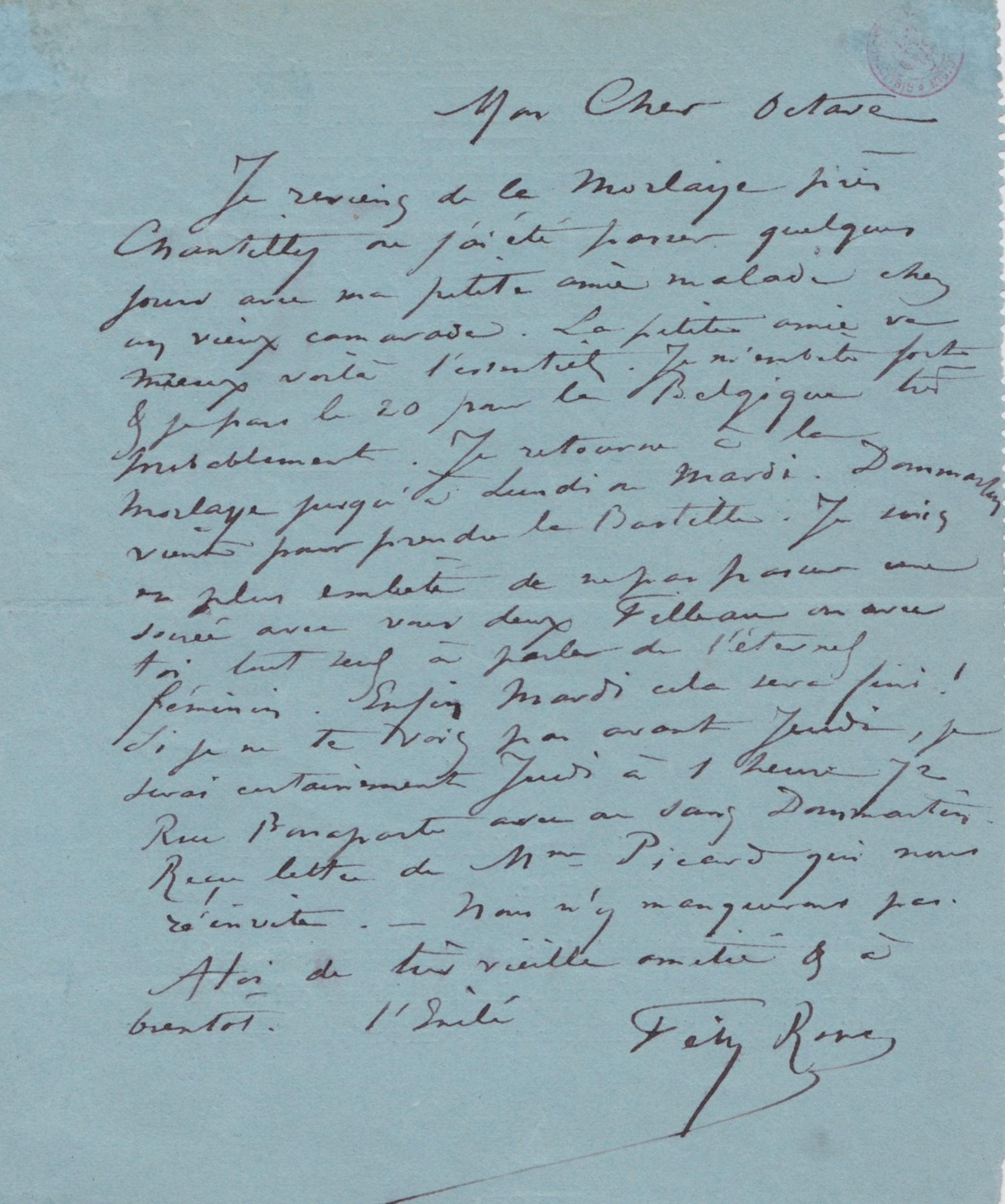 Je reviens de la Morlaye près Chantilly où j’ai été passer quelques jours avec ma petite amie malade chez un vieux camarade. La petite amie va mieux voilà l’essentiel. Je m’embête fort & je pars le 20 pour la Belgique très probablement. Je retourne à la Morlaye jusqu’à Lundi ou Mardi. Dommartin vient pour prendre la Bastille. Je suis en plus embêté de ne pas passer une soirée avec vous deux Filleau ou avec toi tout seul à parler de l’éternel féminin. Enfin Mardi cela sera fini ! Si je ne te vois pas avant Jeudi, je serai certainement Jeudi à 1 heure 72 Rue Bonaparte avec ou sans Dommartin. Reçu lettre de Mme Picard qui nous réinvite. – Nous n’y manquerons pas.