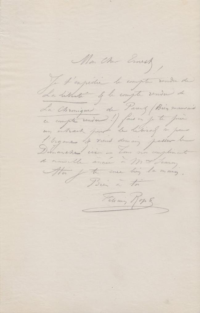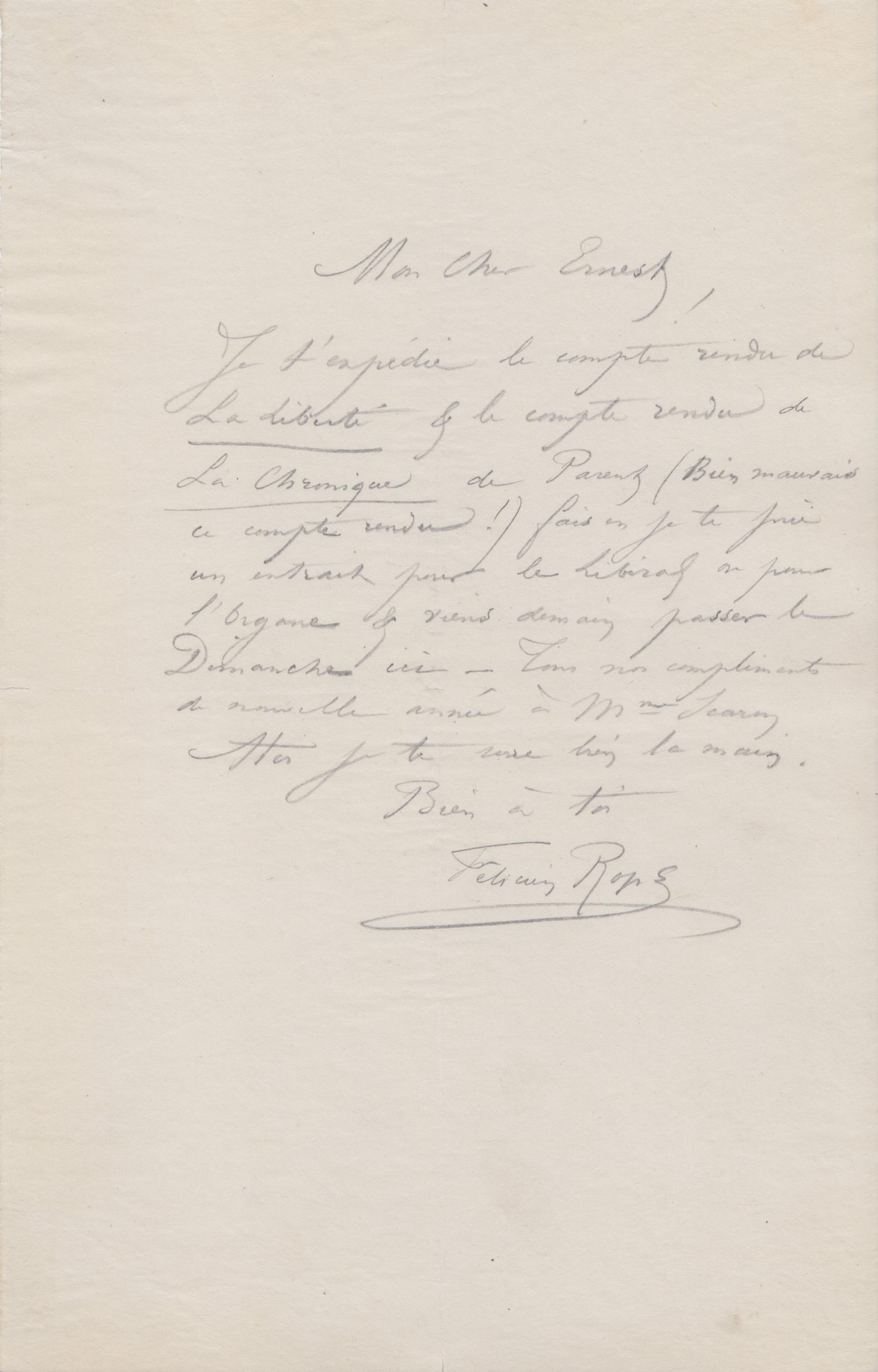 Je t’expédie le compte rendu de La Liberté & le compte rendu de La Chronique de Parent (Bien mauvais ce compte rendu !) fais en je te prie un extrait pour le Libéral ou pour l’Organe & viens demain passer le Dimanche ici – Tous nos compliments de nouvelle année à Mme Scaron.