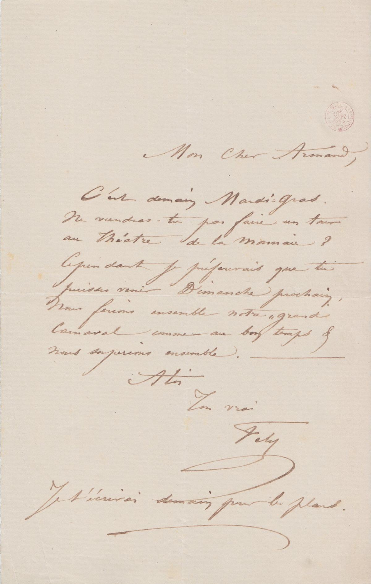 C’est demain Mardi-Gras. Ne viendras-tu pas faire un tour au Théatre de la Monnaie ? Cependant je préfererais que tu puisses venir Dimanche prochain, Nous ferions ensemble notre « grand Carnaval comme au bon temps & nous souperions ensemble. –