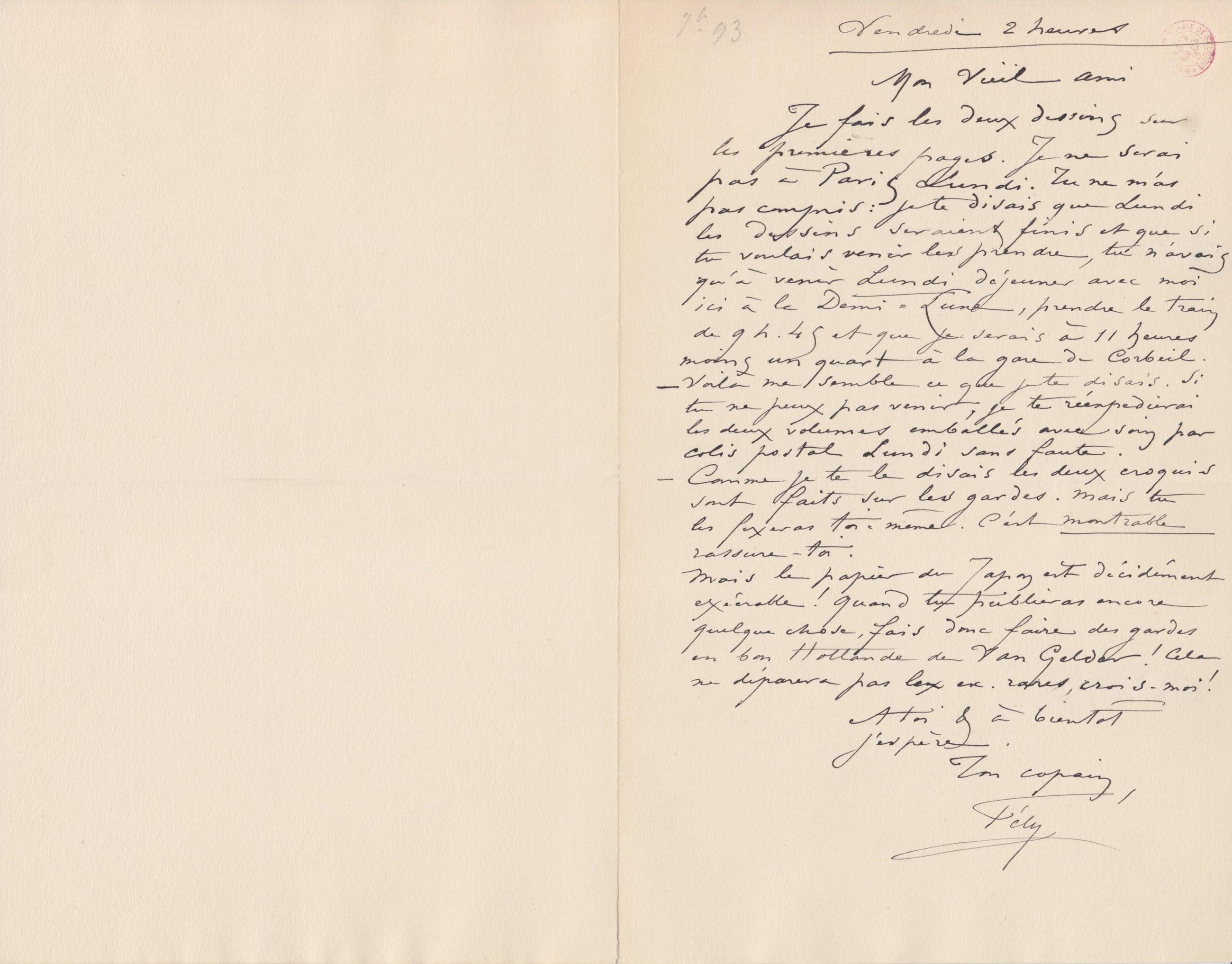 Je fais les deux dessins sur les premières pages. Je ne serai pas à ParisLundi. Tu ne m’as pas compris : je te disais que Lundi les dessins seraient finis et que si tu voulais venir les prendre, tu n’avais qu’à venir Lundi déjeuner avec moi ici à la Demi-Lune, prendre le train de 9 h. 45 et que je serais à 11 heures moins un quart à la gare de Corbeil.