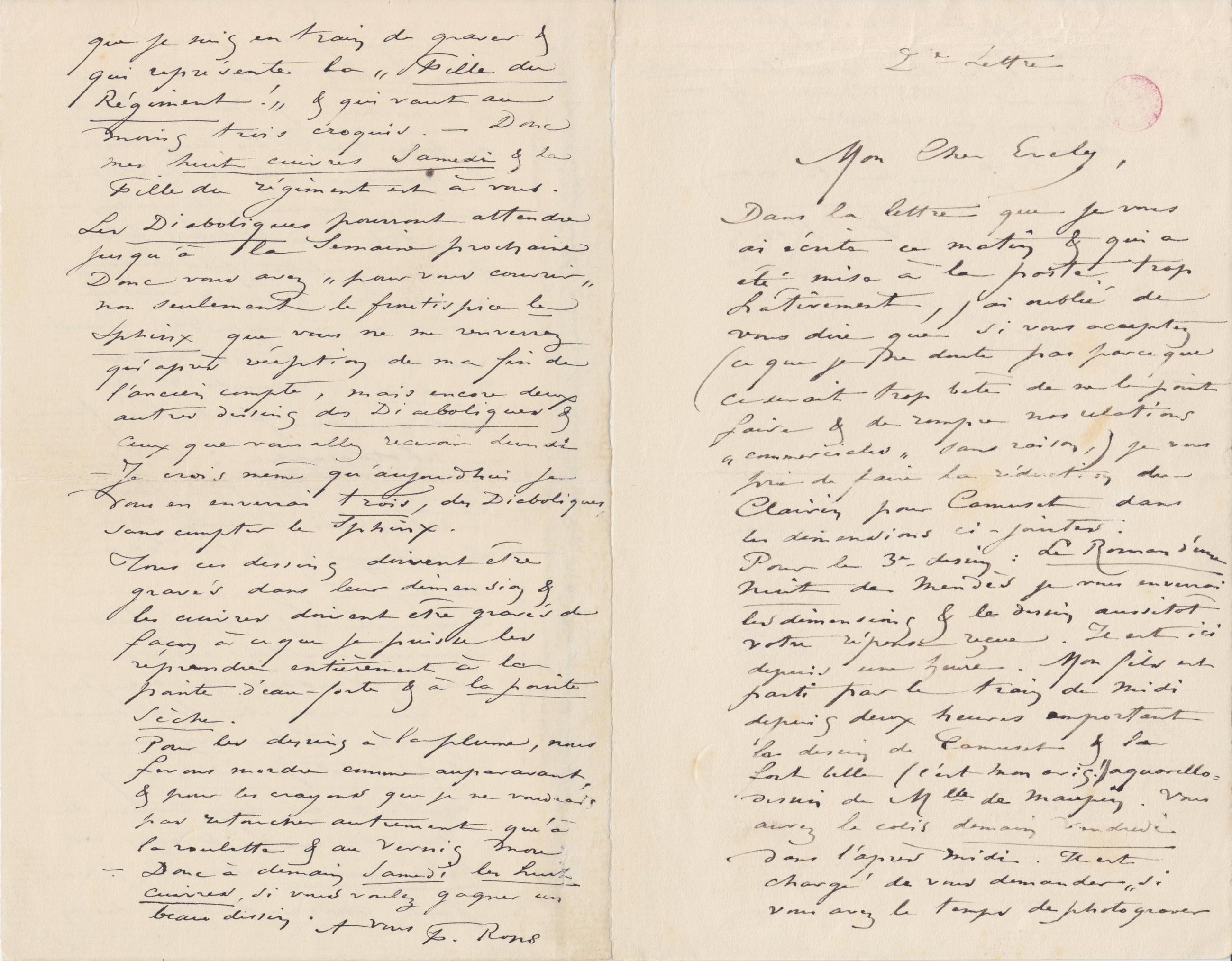 N.B. Ce que j’ai le plus besoin avant tout, c’est de recevoir Dimanche si possible, Lundiau plus tard les deux dessins : Le massage, & le frontispice du Vice Suprême (le gandin avec sa tête sous le bras, & la femme squelette) que vous avez vu chez moi & que je vous expédie. Nous sommes aujourdhui Jeudivous allez tout cela recevoir Vendredi. Samedi votre photographe peut bien faire une photographie : Le Vice Suprême. Aussitôt faite emballez moi les deux dessins Le massage& le Vice Suprême et expédiez, je recevrai cela Dimanche & j’en serai fort heureux. Mais auparavant demain Vendredi par exemple si vous voulez être fort aimable expédiez moi les six cuivres le plus tôt possible en y ajoutant les deux cuivres de Staquet. <