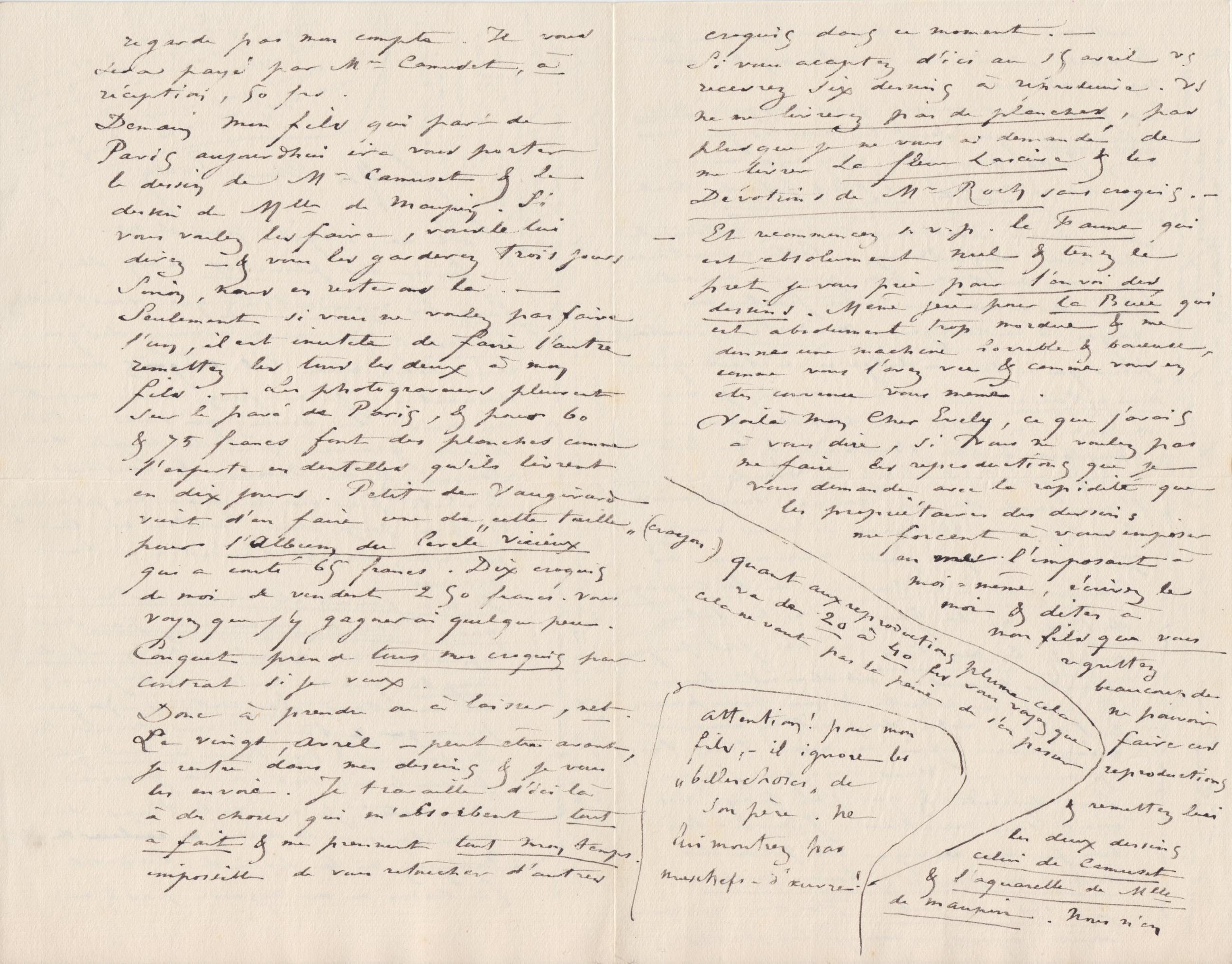 Donc à prendre ou à laisser, net. Le vingt, Avril – peut être avant, je rentre dans mes dessins & je vous les envoie. Je travaille d’ici là à des choses qui m’absorbent tout à fait & me prennent tout mon temps. impossible de vous retoucher d’autres