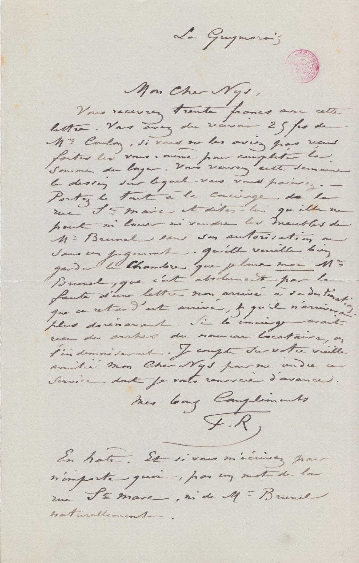 Vous recevrez trente francs avec cette lettre. Vous avez du recevoir 25 frs de Mr Coulon, si vous ne les aviez pas reçus faites les vous-même pour compléter la somme du loyer. Vous recevrez cette semaine le dessin sur lequel vous vous paierez. – Portez le tout à la concierge de la rue St marc et dites-lui qu’elle ne peut ni louer ni vendre les meubles de Mr Brunel sans son autorisation ou sans un jugement. Qu’elle veuille bien garder la chambre que je loue moiMr Brunel, que c’est absolument par la faute d’une lettre non arrivée à sa destination. que ce retard est arrivé, & qu’il n’arrivera plus dorénavant. Si la concierge avait reçu des arrhes du nouveau locataire, on l’indemniserait. Je compte sur votre vieille amitié Mon Cher Nys pour me rendre ce service dont je vous remercie d’avance.