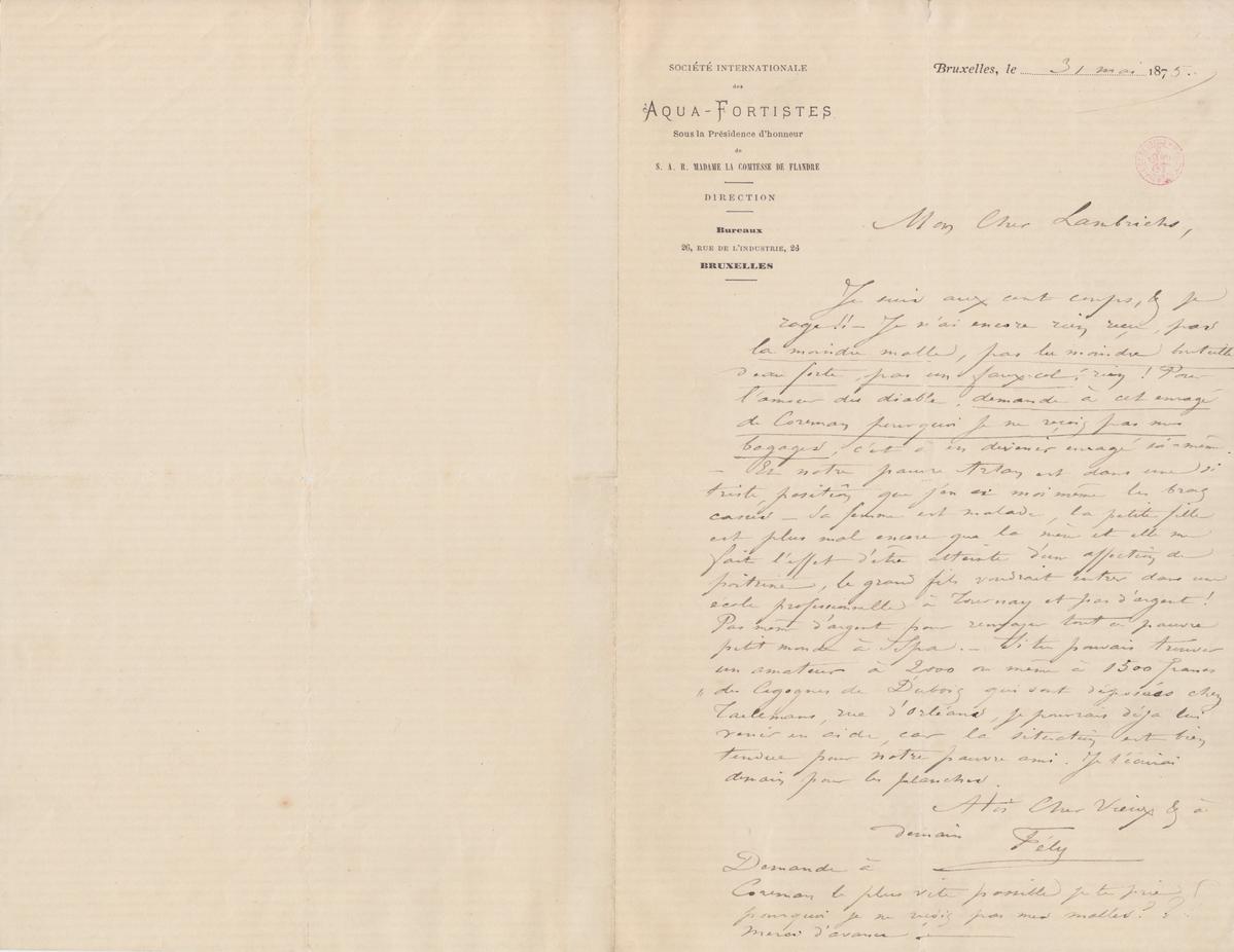 Je suis aux cent coups, & je rage !! – Je n’ai encore rien reçu, pas la moindre malle, pas la moindre bouteille d’eau forte, pas un faux-col ! rien ! Pour l’amour du diable, demande à cet enragé de Coreman pourquoi je ne reçois pas mes bagages, c’est à en devenir enragé soi-même. – Et notre pauvre Artan est dans une si triste position que j’en ai moi même les bras cassés – Sa femme est malade, la petite fille est plus mal encore que la mère et elle me fait l’effet d’être atteinte d’une affection de poitrine, le grand fils voudrait entrer dans une école professionnelle à Tournay et pas d’argent ! Pas même d’argent pour renvoyer tout ce pauvre petit monde à Spa. – Si tu pouvais trouver un amateur à 2000 ou même à 1500 francs « des Cigognes de Dubois qui sont déposées chez Taelemans, rue d’Orléans, je pourrais déjà lui venir en aide, car la situation est bien tendue pour notre pauvre ami. Je t’écrirai demain pour les planches.