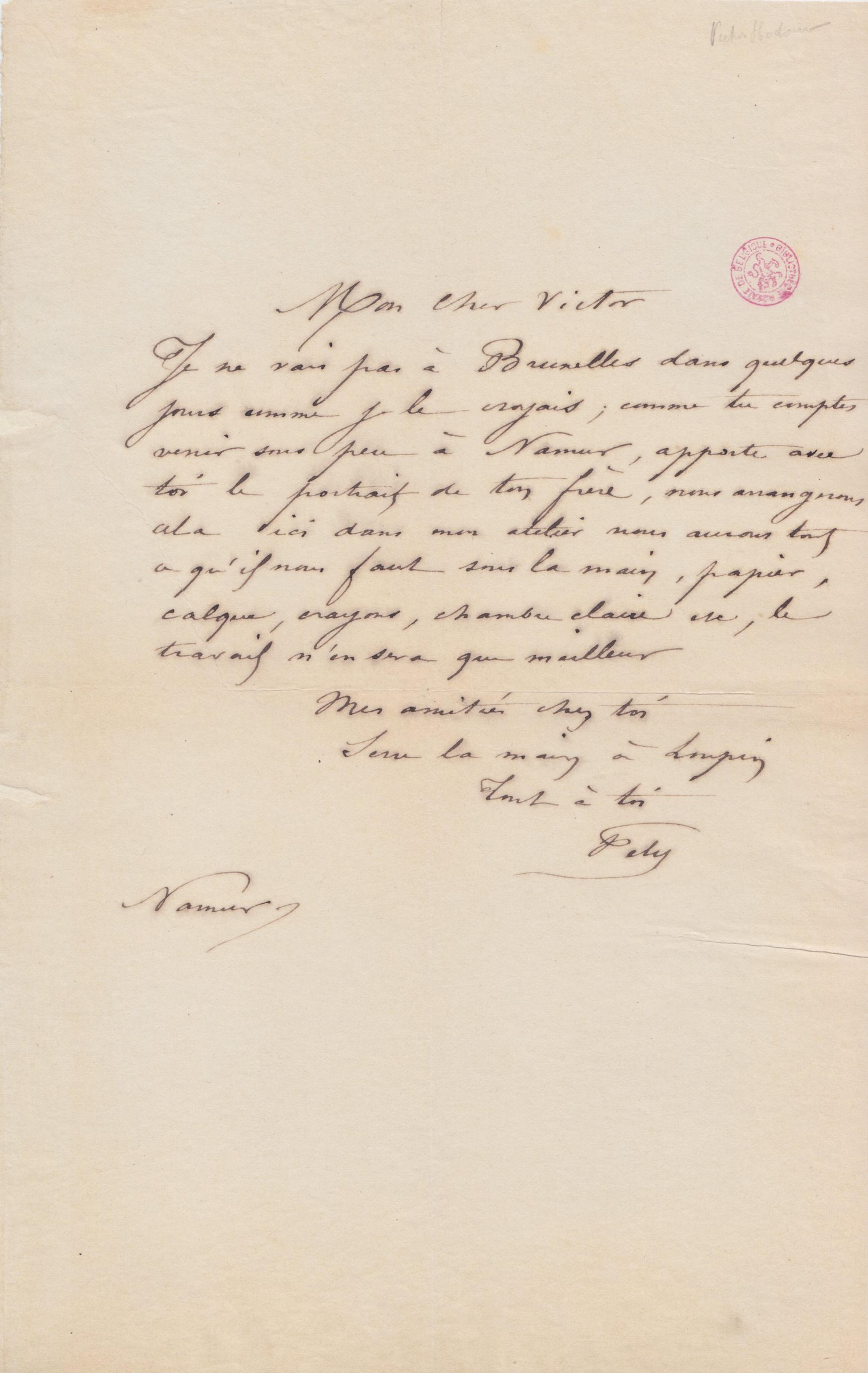 Je ne vais pas à Bruxelles dans quelques jours comme je le croyais ; comme tu comptes venir sous peu à Namur, apporte avec toi le portrait de ton frère, nous arrangerons cela ici dans mon atelier nous aurons tout ce qu’il nous faut sous la main, papier, calque, crayons, chambre claire etc, le travail n’en sera que meilleur