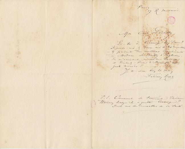 Es-tu à Coarraze lez Pau ? Réponds-moi, & donne moi de tes nouvelles ; – & présente mes meilleurs compliments à Madame Le Bailly d’Inghuem. – En m’écrivant envoie-moi l’adresse de Tinant : Rue d’Armaillé mais quel numéro ? –