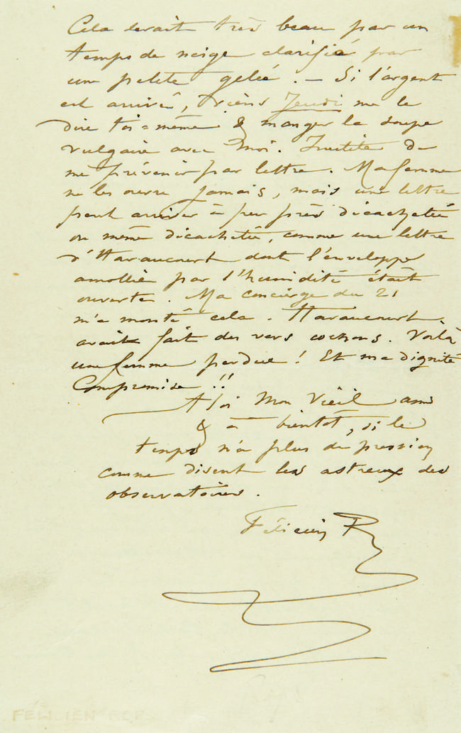 ... Ah !! attention. Péladan va t'envoyer pour moi 300 francs ou 350, je ne sais pas au juste. C'est pour la "bonne dame", ce pauvre garçon en a peur, & tâche de faire ce qu'il peut & même plus qu'il ne peut! Comme je ne veux pas avoir l'air de m'occuper de cette imposante Madame, je te fais adresser chez toi la somme, qui viendra très probablement de Marseille, où se trouve le héros Joséphin Péladan, pour l'instant. - À bientôt mon vieil. Si le ciel s'éclaire, j'irai Mercredi à la Rochellaire.