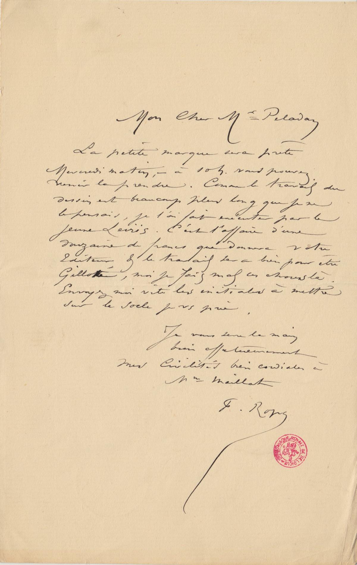 La petite marque sera prête Mercredi matin, – à 10 h. vous pouvez venir la prendre. Comme le travail du dessin est beaucoup plus long que je ne le pensais, je l’ai fait exécuter par le jeune Leiris. C’est l’affaire d’une douzaine de francs que donnera votre Éditeur & le travail sera bien pour être Gilloté, moi je fais mal ces choses là. Envoyez moi vite les initiales à mettre sur le socle je v[ou]s prie.