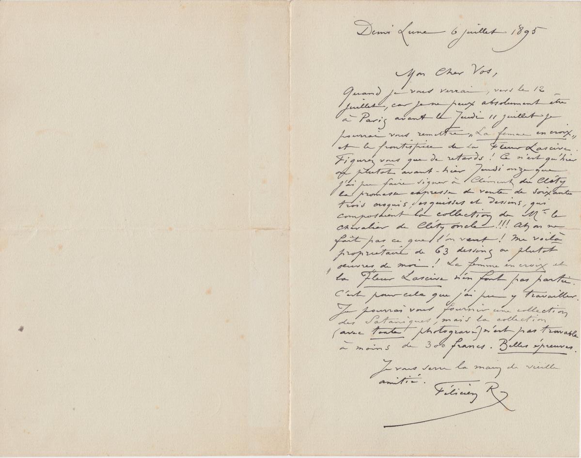 Quand je vous verrai, vers le 12 juillet, car je ne peux absolument être à Paris avant le Jeudi 11 juillet je pourrai vous remettre « La femme en croix » et le frontispice de la Fleur Lascive. Figurez vous que de retards ! Ce n´est qu´hier ou plutôt avant-hier Jeudi onze que j´ai pu faire signer à Clément du Cléty la promesse expresse de vente de soixante trois croquis, esquisses et dessins, qui composaient la collection de Mr le chevalier de Cléty oncle !!! Ah on ne fait pas ce que l’on veut ! Me voilà propriétaire de 63 dessins ou plutôt « œuvres » de moi ! La femme en croix et la Fleur Lascive n’en font pas partie. C´est pour cela que j´ai pu y travailler. Je pourrai vous fournir une collection des Sataniques, mais la collection (avec texte photogravé) n´est pas trouvable à moins de 300 francs. Belles épreuves.