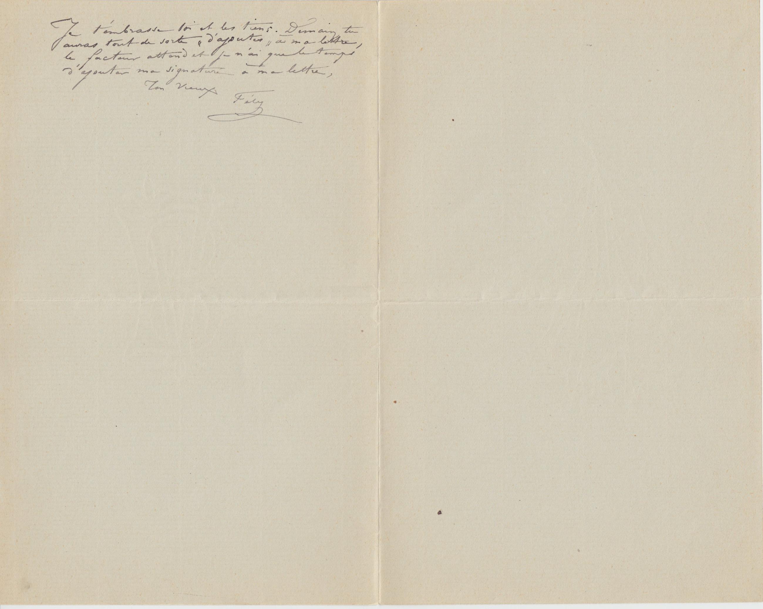 Je t’embrasse toi et les tiens. Demain, tu auras tout de sorte « d’ajoutes » à ma lettre, le facteur attend et je n’ai que le temps d’ajouter ma signature à ma lettre,