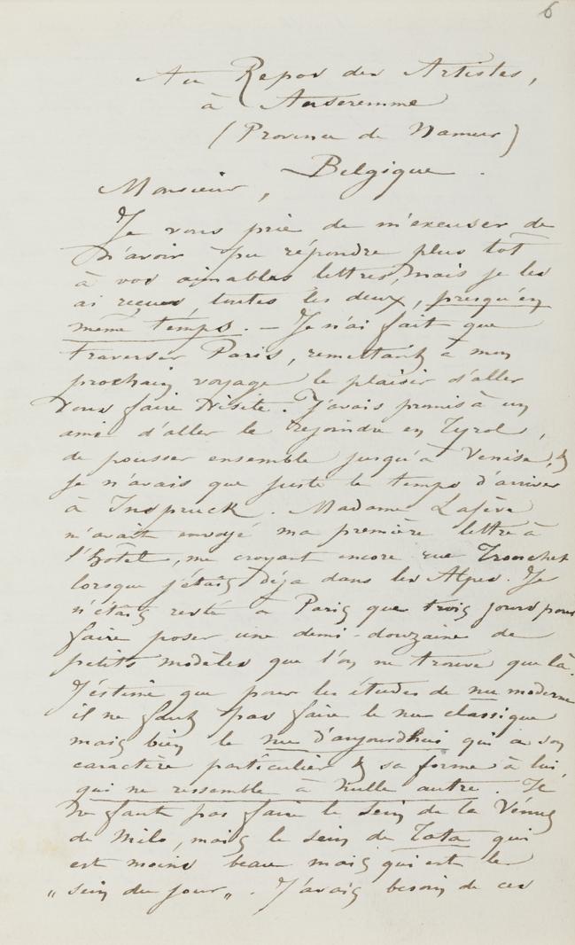 Je vous prie de m’excuser de n’avoir pu répondre plus tôt à vos aimables lettres, mais je les ai reçues, toutes les deux, presqu’en même temps. – Je n’ai fait que traverser Paris, remettant à mon prochain voyage le plaisir d’aller vous faire visite. J’avais promis à un ami d’aller le rejoindre en Tyrol, de pousser ensemble jusqu’à Venise, & je n’avais que juste le temps d’arriver à Inspruck. Madame Lafève m’avait envoyé ma première lettre à l’hôtel, me croyant encore rue Tronchet lorsque j’étais déja dans les Alpes. Je n’étais resté à Paris que trois jours pour faire poser une demi-douzaine de petits modèles que l’on ne trouve que là. J’estime que pour les études de nu moderne il ne faut pas faire le nu classique mais bien le nu d’aujourdhui qui a son caractère particulier & sa forme à lui, qui ne ressemble à nulle autre. Il ne faut pas faire le sein de la Vénus de Milo, mais le sein de Tata qui est moins beau mais qui est le « sein du jour ». J’avais besoin de ces