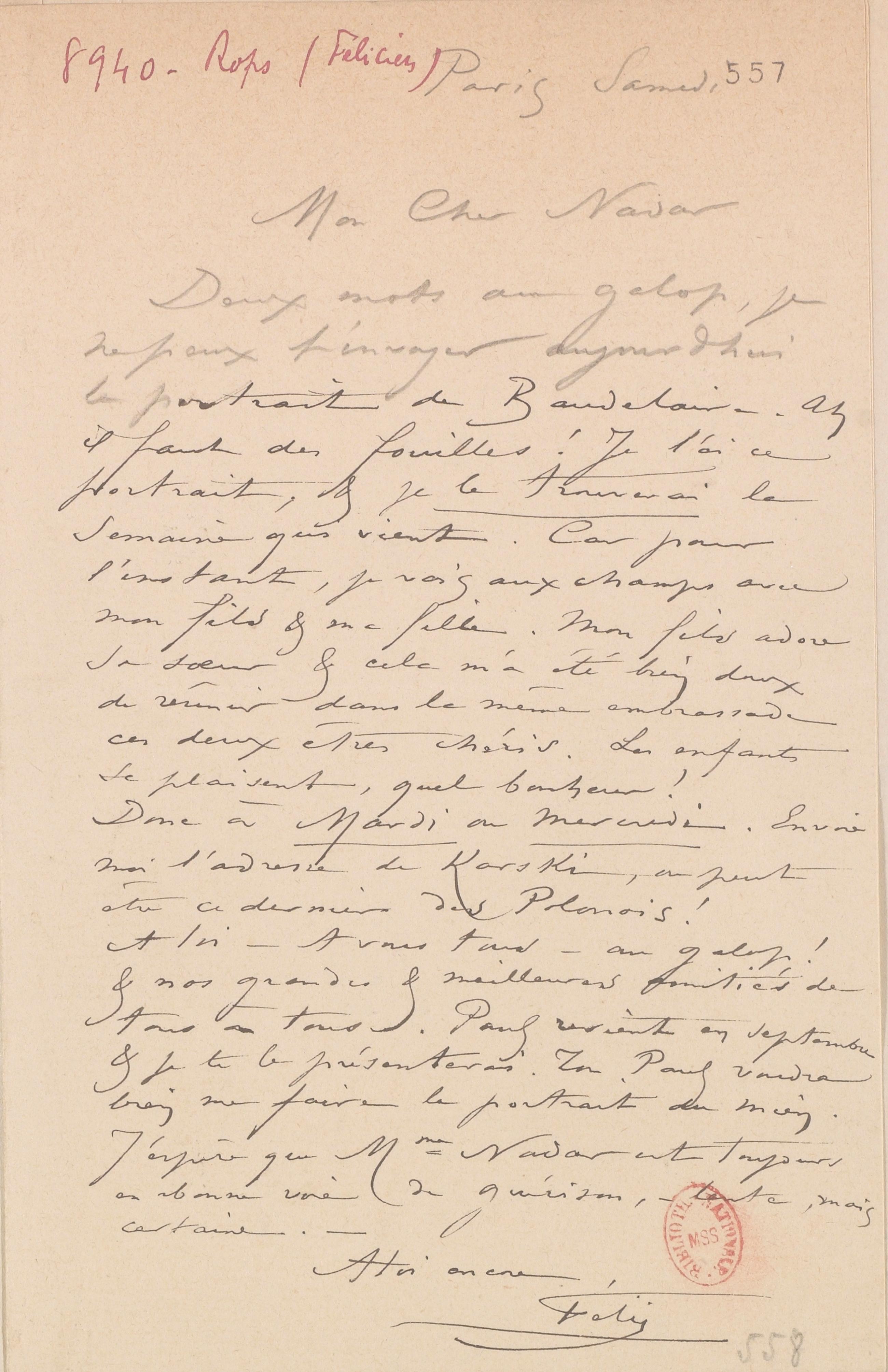 À toi – À vous tous – au galop ! & nos grandes & meilleures amitiés de tous à tous. Paul revient en septembre & je te le présenterai. Ton Paul voudra bien me faire le portrait du mien. J’espère que Mme Nadar est toujours en bonne voie de guérison, – lente, mais certaine. –