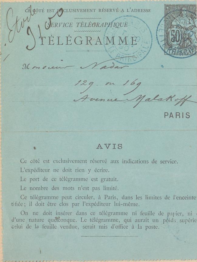 Monsieur Nadar129. ou 169 Avenue Malakoff Page 1 Verso : 2