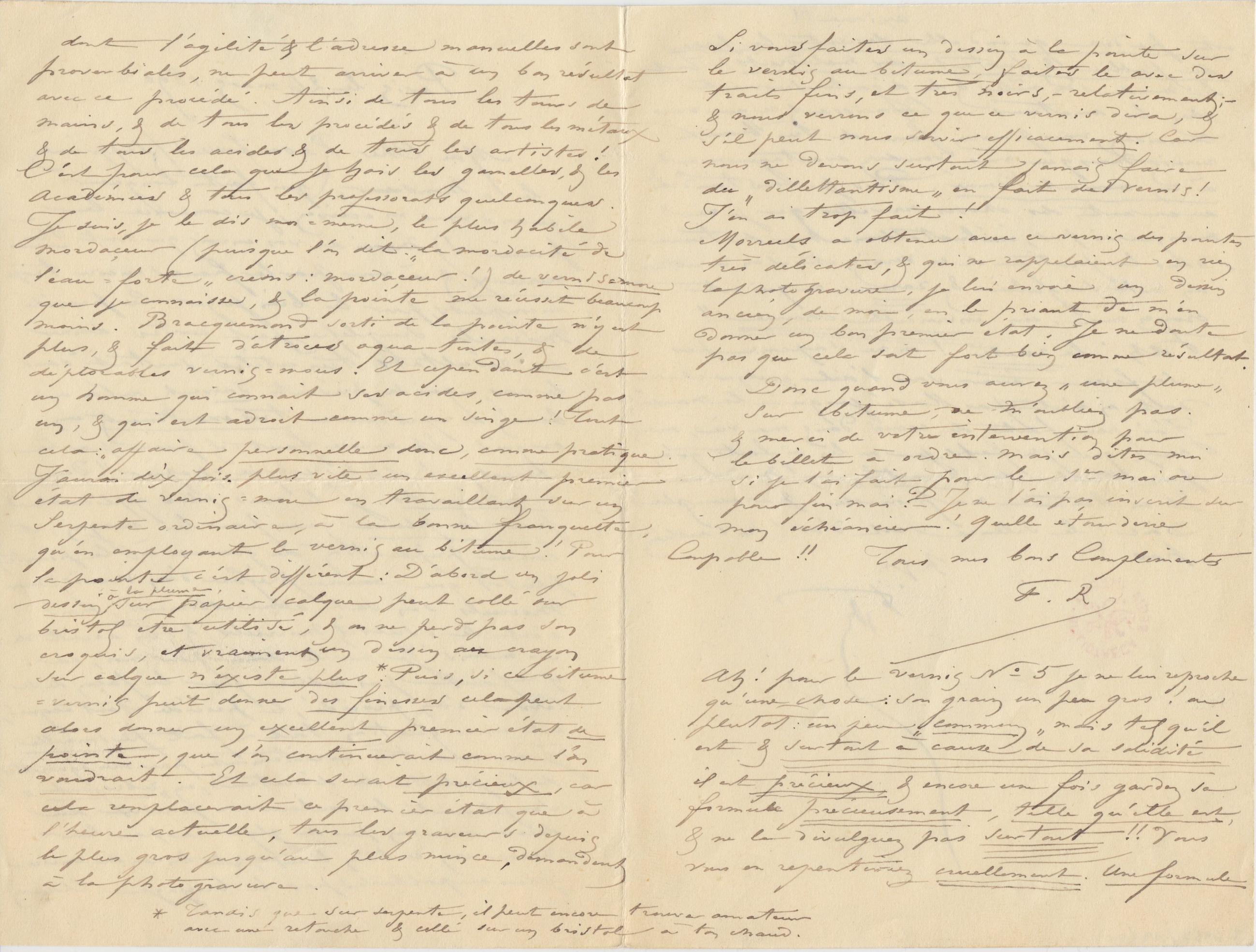 Si vous faites un dessin à la pointe sur le vernis au bitume, faites le avec des traits fins, et très noirs, – relativement ; – & nous verrons ce que ce vernis dira, & s’il peut nous servir efficacement. Car nous ne devons surtout jamais faire du « dillettantisme » en fait de vernis ! J’en ai trop fait !