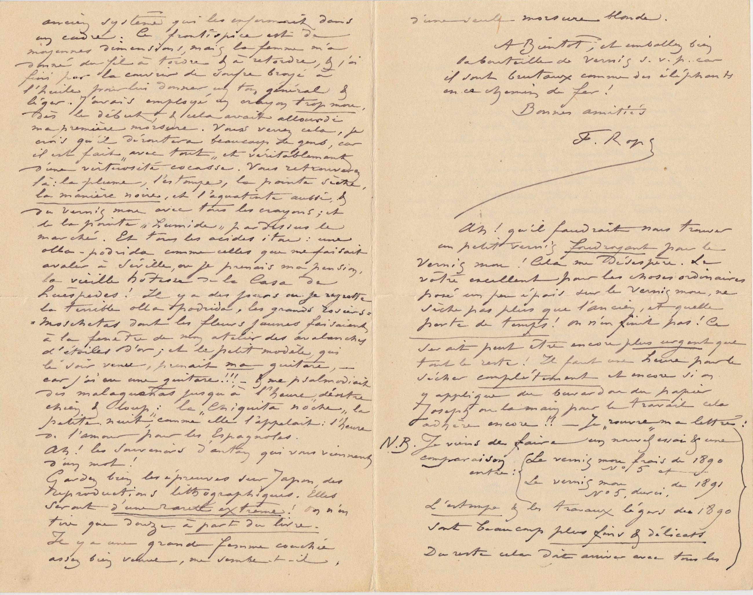 Ah ! qu'il faudrait nous trouver un petit vernis foudroyant pour le vernis mou ! Cela me désespère. Le vôtre excellent pour les choses ordinaires posé un peu épais sur le vernis mou, ne sèche pas plus que l'ancien, et quelle perte de temps ! on n'en finit pas ! Ce serait peut être encore plus urgent que tout le reste ! Il faut une heure pour le sécher complètement et encore si on y applique du buvard ou du papier Joseph ou la main pour le travail cela adhère encore !! – Je rouvre ma lettre :