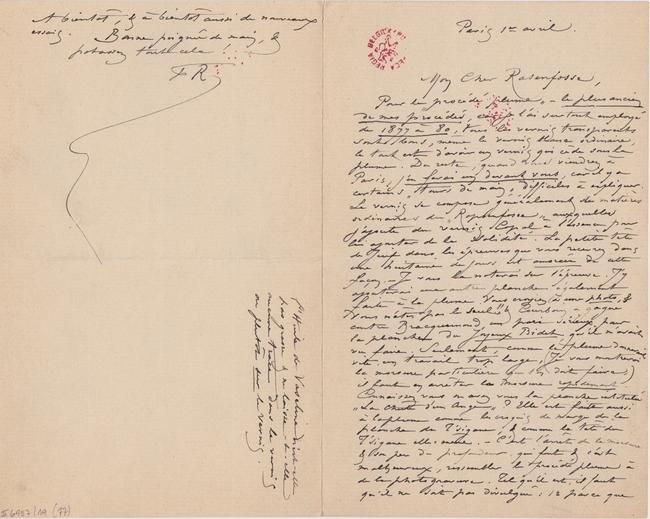 Le frontispice de Darzens évoqué est également mentionné dans une autre lettre datée du 8 avril 1891 conservée dans le même fonds. Voir : inv. II/6957/19/65b. – N° d’édition : 1736.