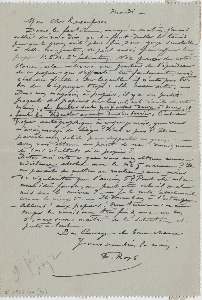 Dites moi vite ce que vous avez obtenu comme résistance absolue avec le n°5 nouveau ? Il me paraît se mettre au rouleau avec moins de régularité que l’ancien 5 ? Peut être est ce une idée fausse, ou peut être est‑il mal mis sur le cuivre ? – Je le mets absolument comme le vieux 5. – Il donne bien à l’estompe.
