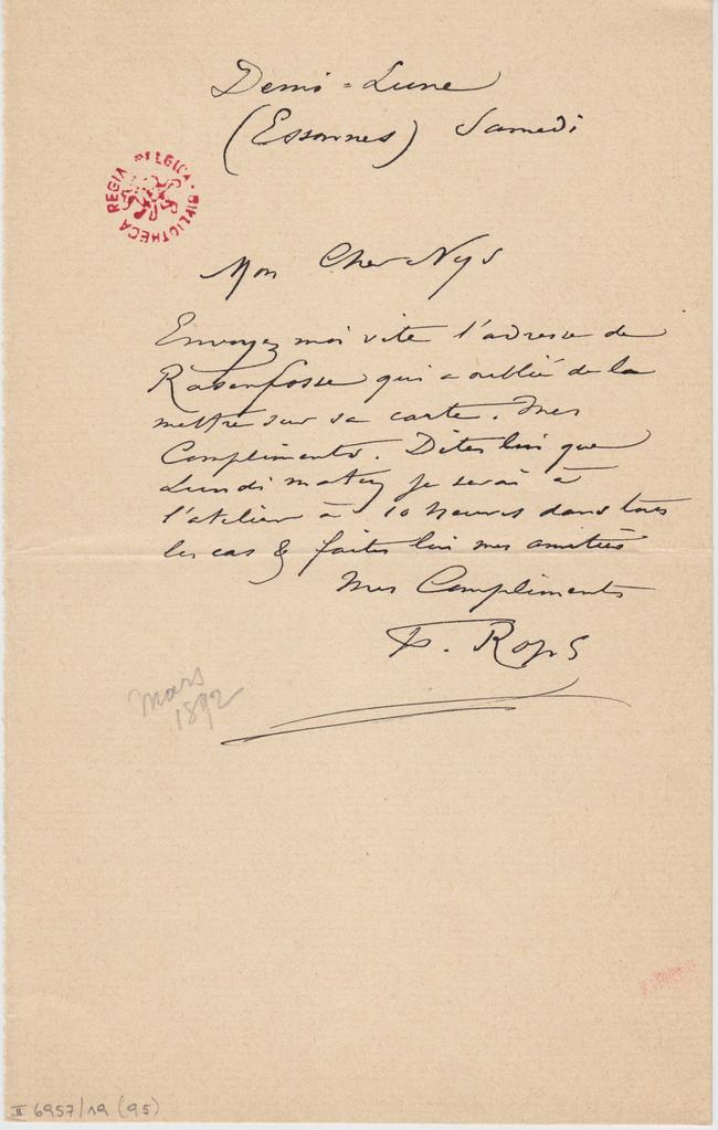 Envoyez moi vite l’adresse de Rasenfosse qui a oublié de la mettre sur sa carte. Mes compliments. Dites lui que Lundi matin je serai à l’atelier à 10 heures dans tous les cas & faites lui mes amitiés