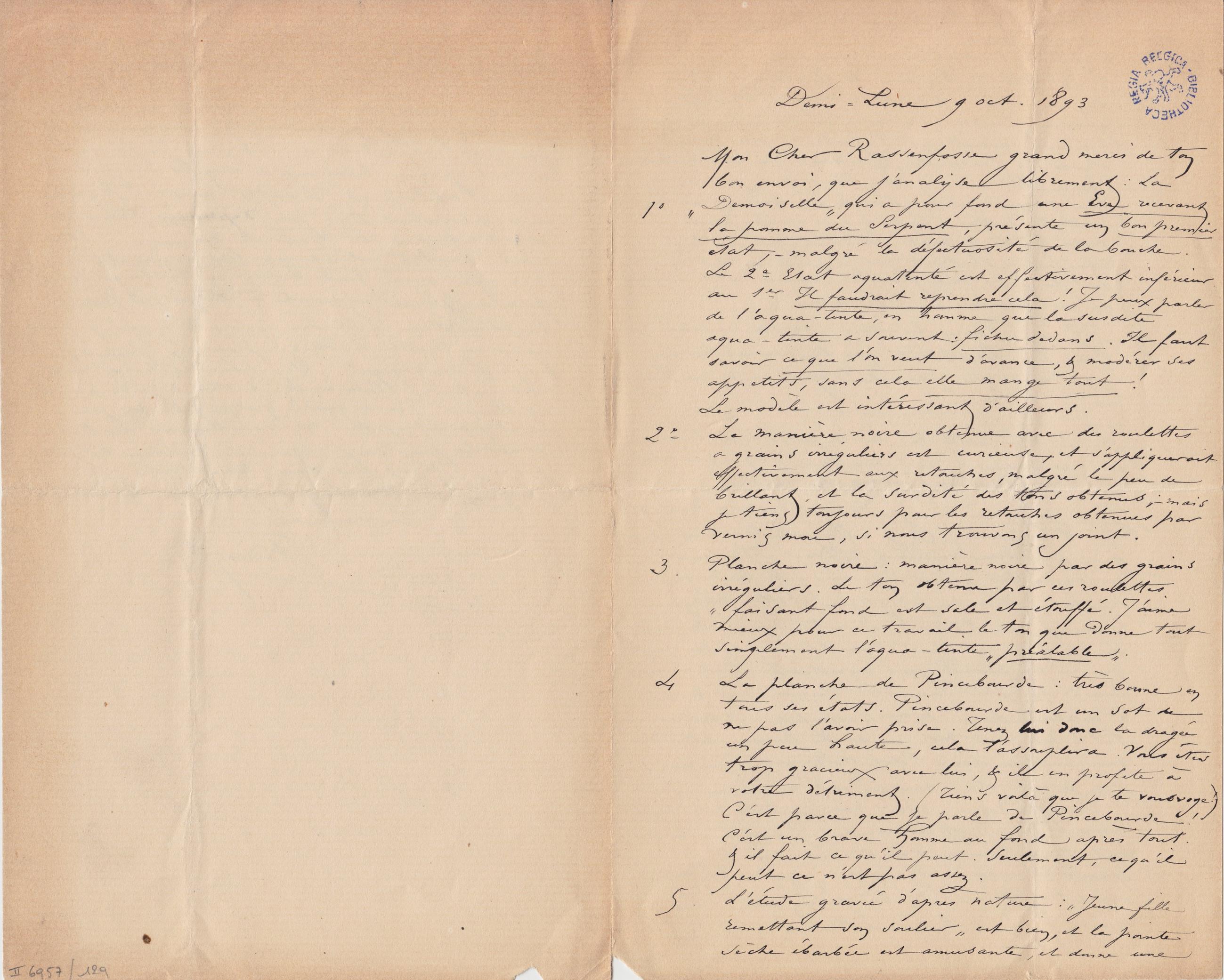 2° La manière noire obtenue avec des roulettes a grains irréguliers est curieuse, et s’appliquerait effectivement aux retouches, malgré le peu de brillant, et la surdité des tons obtenus ; – mais je tiens toujours pour les retouches obtenues par Vernis mou, si nous trouvons un joint.