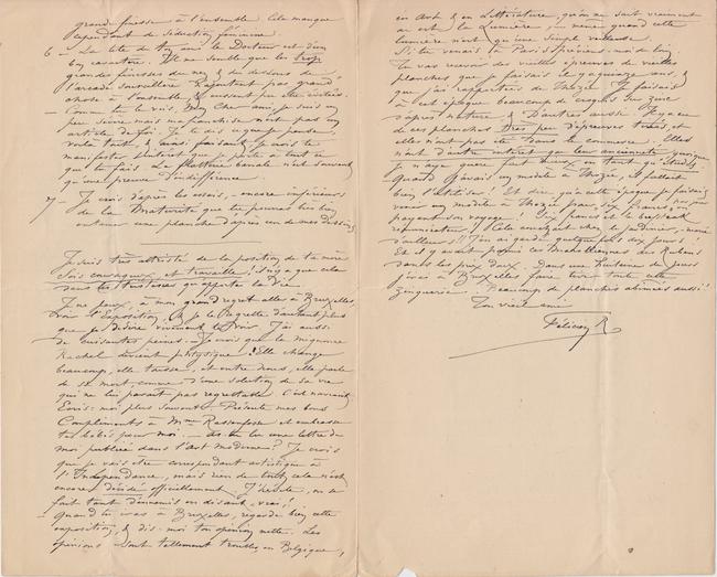 Je ne peux, à mon grand regret aller à Bruxelles, voir l’Exposition, & je le regrette d’autant plus que je désire vivement te Voir. J’ai aussi de cuisantes peines. – Je crois que la mignonne Rachel devient phtysique ! Elle change beaucoup, elle tousse, et entre nous, elle parle de sa mort, comme d’une solution de sa vie qui ne lui paraît pas regrettable. C’est navrant. Écris-moi plus souvent. Présente mes bons Compliments à Mme Rassenfosse et embrasse tes bébés pour moi. – As-tu lu une lettre de moi publiée dans l’Art Moderne ? Je crois que je vais être correspondant artistique à l’Indépendance, mais rien de tout cela n’est encore décidé officiellement. J’hésite, on se fait tant d’ennemis en disant « vrai » !