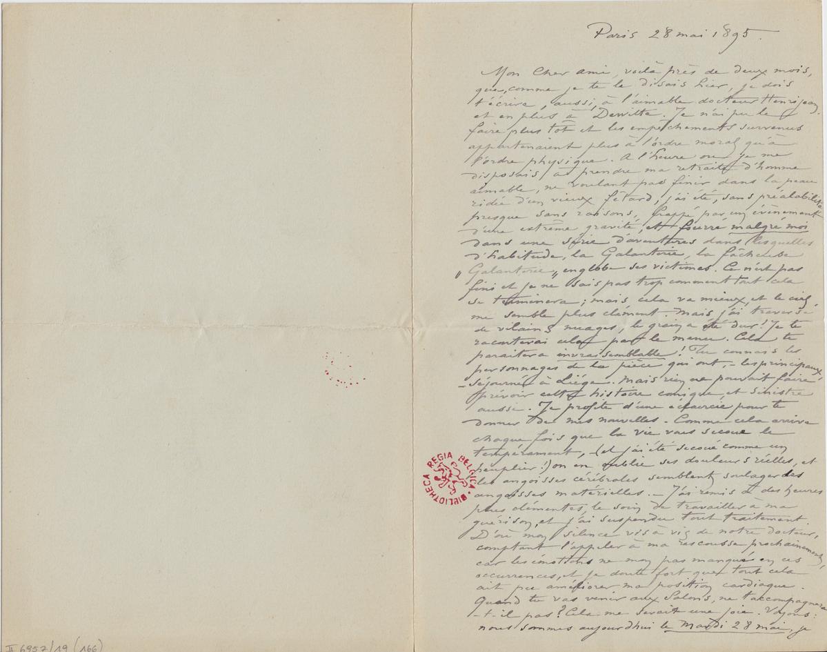 Mon Cher Ami, voilà près de deux mois, que, comme je te le disais hier, je dois t’écrire, aussi, à l’aimable docteur Henrijean, et en plus à Dewitte. Je n’ai pu le faire plus tôt et les empêchements survenus appartenaient plus à l’ordre moral qu’à l’ordre physique. À l’heure où je me disposais à prendre ma retraite d’homme aimable, ne voulant pas finir dans la peau ridée d’un vieux fêtard, j’ai été, sans préalabilité, presque sans raisons, frappé par un évènement d’une extrême gravité, et fourré malgré moi dans une série d’aventures dans lesquelles d’habitude, la Galanterie, la fâcheuse « Galanterie » englobe ses victimes. Ce n’est pas fini et je ne sais pas trop comment tout cela se terminera ; mais cela va mieux, et le ciel me semble plus clément. Mais j’ai traversé de vilains nuages, le grain a été dur ! Je te raconterai cela par le menu. Cela te paraitera invraisemblable ! Tu connais les personnages de la pièce qui ont, – les principaux, – séjourné à Liége. Mais rien ne pouvait faire prévoir cette histoire comique, et sinistre aussi. Je profite d’une éclaircie pour te donner de mes nouvelles. Comme cela arrive chaque fois que la Vie vous secoue le tempérament, – (et j’ai été secoué comme un peuplier !) on en oublie ses douleurs réelles, et les angoisses cérébrales semblent soulager des angoisses matérielles. – J’ai remis à des heures plus clémentes, le soin de travailler à ma guérison, et j’ai suspendu tout traitement. D’où mon silence vis à vis de notre docteur, comptant l’appeler à ma rescousse prochainement, car les émotions ne mon pas manqué en ces occurrences, et je doute fort que tout cela ait pu améliorer ma position cardiaque. Quand tu vas venir aux Salons, ne t’accompagnera-t-il pas ? Cela me serait une joie. Voyons : nous sommes aujourdhui le Mardi 28 mai, je