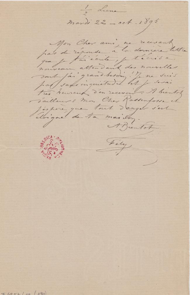 Mon Cher ami, ne recevant pas de réponse à la dernière lettre que je t’ai écrite, je t’écris à nouveau attendant des nouvelles dont j’ai grand besoin ! Je ne suis pas sans inquiétude et je serai très heureux d’en recevoir. À bientôt d’ailleurs Mon Cher Rassenfosse et j’espère que tout danger s’est éloigné de ta maison.