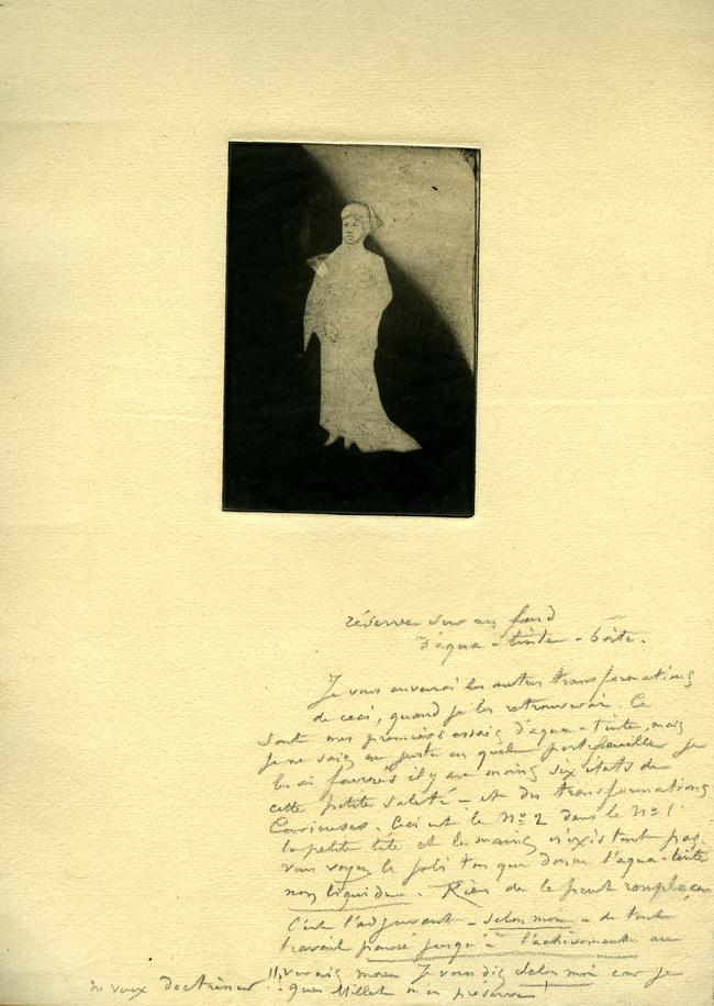 Je vous enverrai les autres transformations de ceci, quand je les retrouverai. Ce sont mes premiers essais d'aqua-tinte, mais je ne sais au juste en quel portefeuille je les ai fourrés il y au moins six états de cette petite saleté – et des transformations Curieuses. Ceci est le n°2 dans le n°1 la petite tête et les mains n'existent pas. vous voyez le joli ton que donne l'aqua-tinte non liquide. Rien ne le peut remplacer C'est l'adjuvant – selon moi – de tout travail poussé jusqu'à l'achèvement au vernis mou Je vous dis selon moi car je ne veux doctriner !!! que Millet m'en préserve !