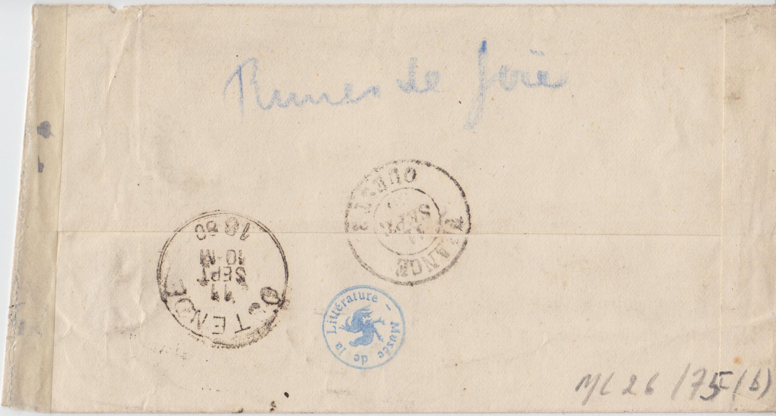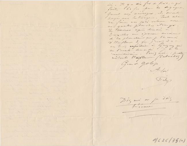 Tu recevras après-demain à Bruxelles une épreuve ancienne de la planche que je t’enverrai d’Honfleur & que j’avais il y a un mois expédiée à Gouzien qui me l’avait demandée. Je te la réexpédierai. Écris moi : poste restante Honfleur (Calvados.)