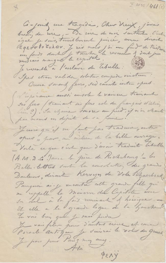 Je crois qu’il ne faut pas traduire «inter opus» par « au milieu de la belle ouvrage » – Voilà ce que c’est que d’avoir traduit Tibulle (A.M.D.G !) avec le père de Richebourg ! – les Belles-lettres sont la consolation des grandes Douleurs » dirait Kervyn de Vole Schaerbeck. Pourquoi ai-je rencontré cette grande fille qui me rappelle la Minerve du Capitole avec Son œil à la fois ruminant & héroïque. – Et elle a la grande ligne de la hanche ! Tu vois bien que je suis perdu.
