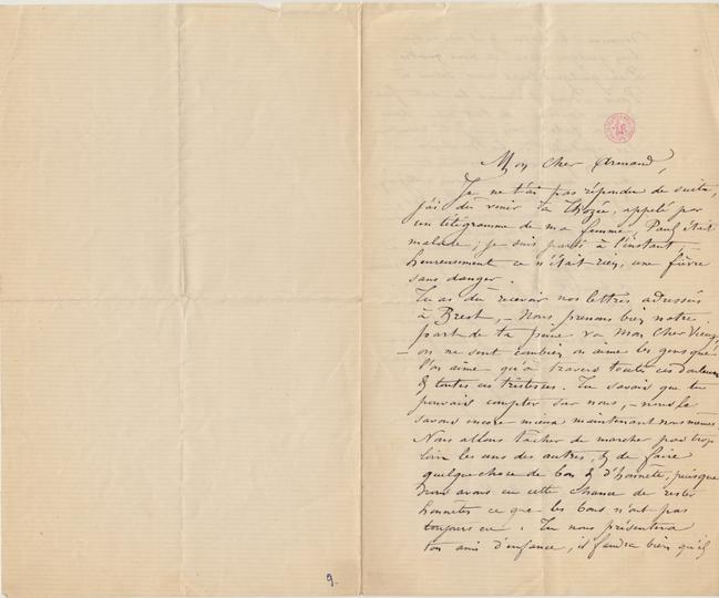 Tu as dû recevoir nos lettres adressées à Brest, – Nous prenons bien notre part de ta peine va Mon Cher Vieux, – on ne sent combien on aime les gens que l’on aime qu’à travers toutes ces douleurs & toutes ces tristesses. Tu savais que tu pouvais compter sur nous, – nous le savons encore mieux maintenant nous mêmes. Nous allons tâcher de marcher pas trop loin les uns des autres, & de faire quelque chose de bon & d’honnête, puisque nous avons eu cette chance de rester honnêtes ce que les bons n’ont pas toujours eu. Tu nous présentera ton ami d’enfance, il faudra bien qu’il