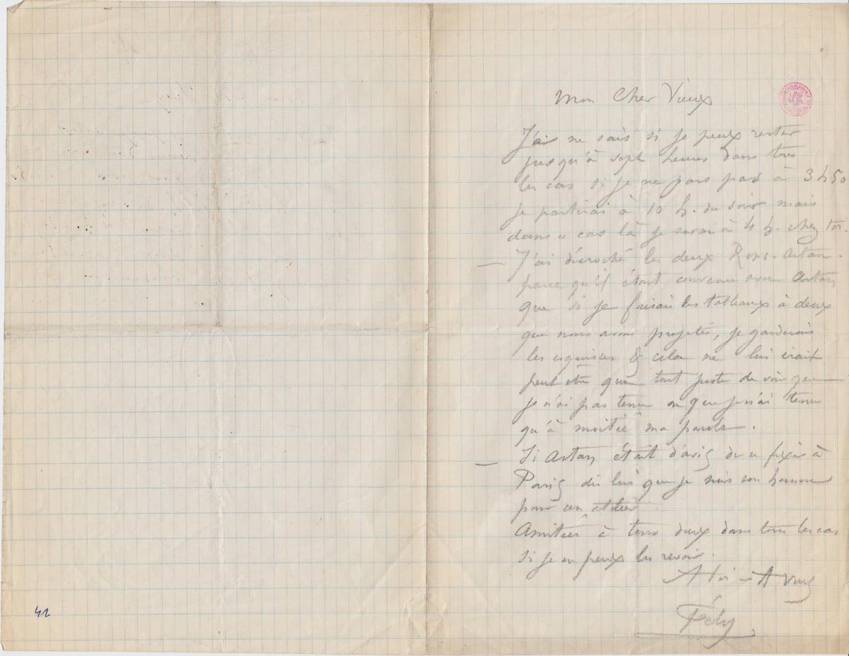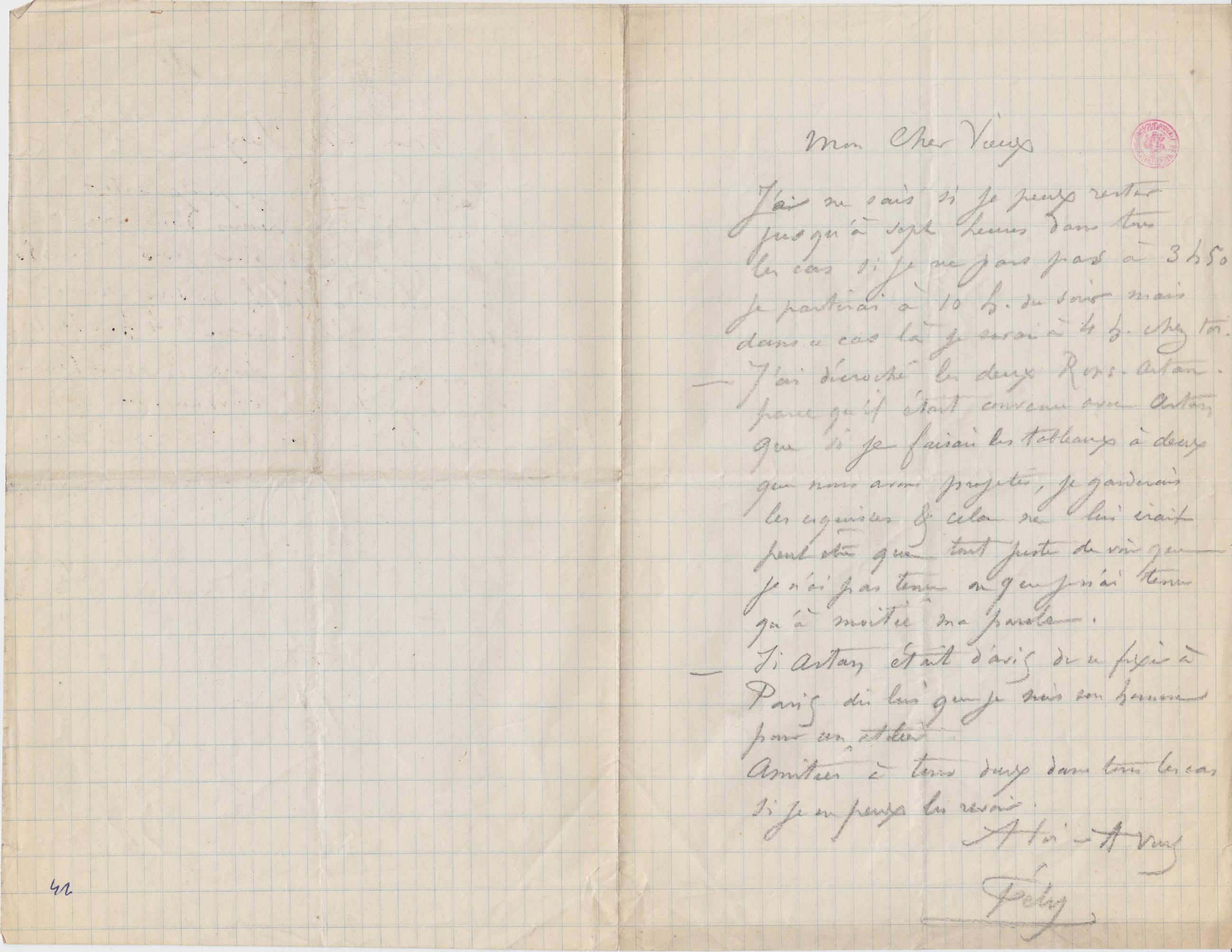 Je ne sais si je peux rester jusqu’à sept heures dans tous les cas si je ne pars pas à 3 h 50 je partirai à 10h. du soir mais dans ce cas là je serai à 4 h. chez toi.