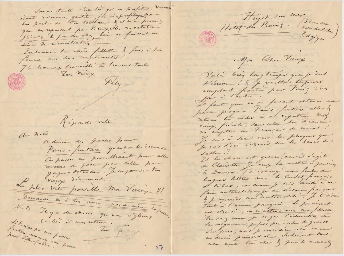 une somme de Cent francs compte pour moi. Il faut que j’aille à Paris pour que Claire fasse ses adieux à tout le monde, essaie son petit trousseau, cela fait « un retour » pour moi, je paie le voyage de Clairette d’ici à Paris. De Paris je reviens m’embarquer avec elle à Ostende, – (d’Ostende cela ne me coûte rien, les officiers de la marine de l’État sont tous mes amis) cela me fait un aller. Je redeviendrai en troisième n’importe comment. – Donc si tu m’obtiens une passe aller & retour de Paris à la frontière, tu me rendras un vrai service, Mon Vieux.
