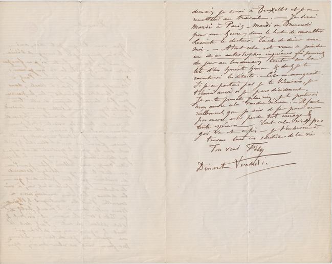 demain je serai à Bruxelles et je me remettrai au travail. – Je serai Mardi à Paris – Mardi ou Mercredi pour une heure, dans le but de consulter Lecointe le docteur. Tâche de dîner avec moi. – À tout cela est venue se joindre une de ces catastrophes imprévues qui peuvent du jour au lendemain tomber sur la tête d’un honnête homme & dont je te raconterai les détails. – Cela me manquait. Si je ne partais pas je te l’écrirais, je t’écrirai aussi si je pars décidément. Je ne te promets plus rien, je te porterai mon œuvre cela vaudra mieux. – Il faut réellement que je sois de fer pour ne pas encore avoir perdu tout courage & toute espérance – Tout cela n’est pas gai va et enfin – je t’embrasse à travers tous ces idiotismes de la vie.