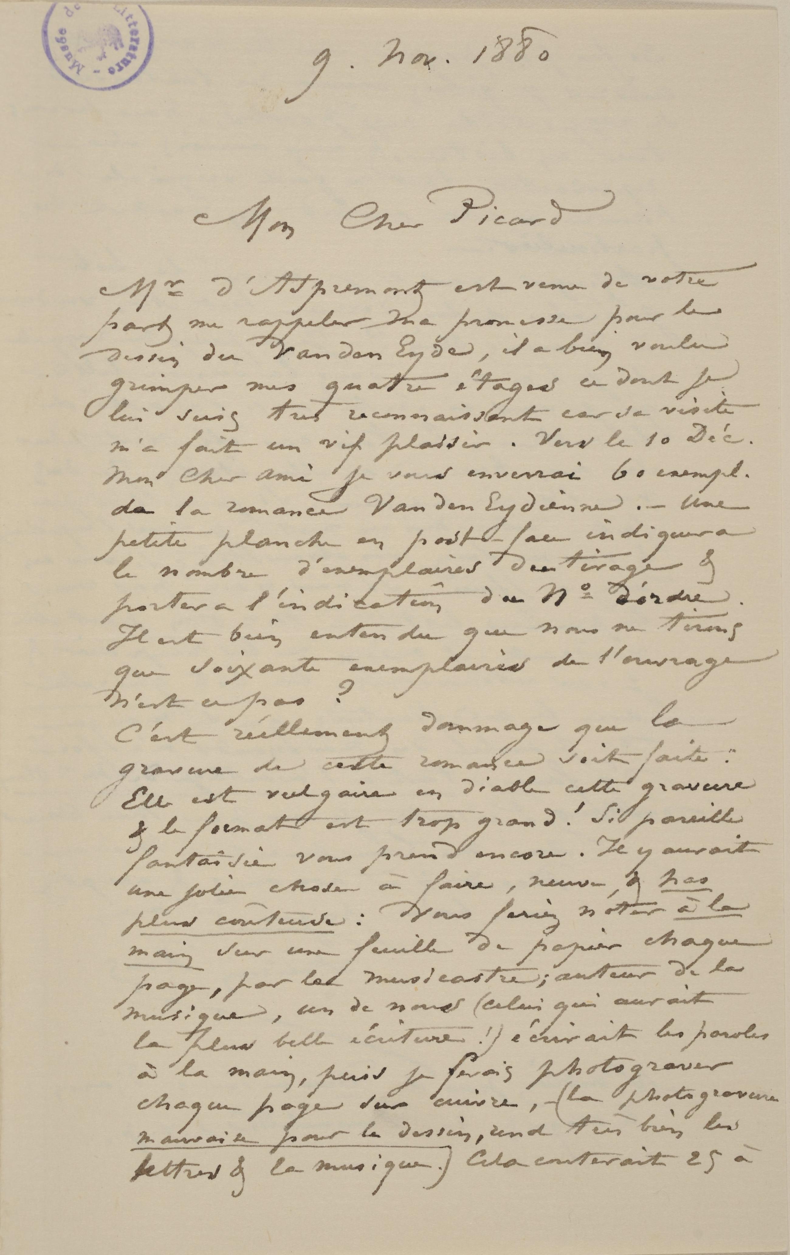 Mr d’Aspremont est venu de votre part me rappeler ma promesse pour le dessin du Van den Eyde, il a bien voulu grimper mes quatre étages ce dont je lui suis très reconnaissant car sa visite m’a fait un vif plaisir. Vers le 10 Déc. Mon Cher Ami je vous enverrai 60 exempl. de la romance Van den Eydienne. – Une petite planche en post-face indiquera le nombre d’exemplaires du tirage & portera l’indication du N° d’ordre. Il est bien entendu que nous ne tirons que soixante exemplaires de l’ouvrage n’est ce pas ?