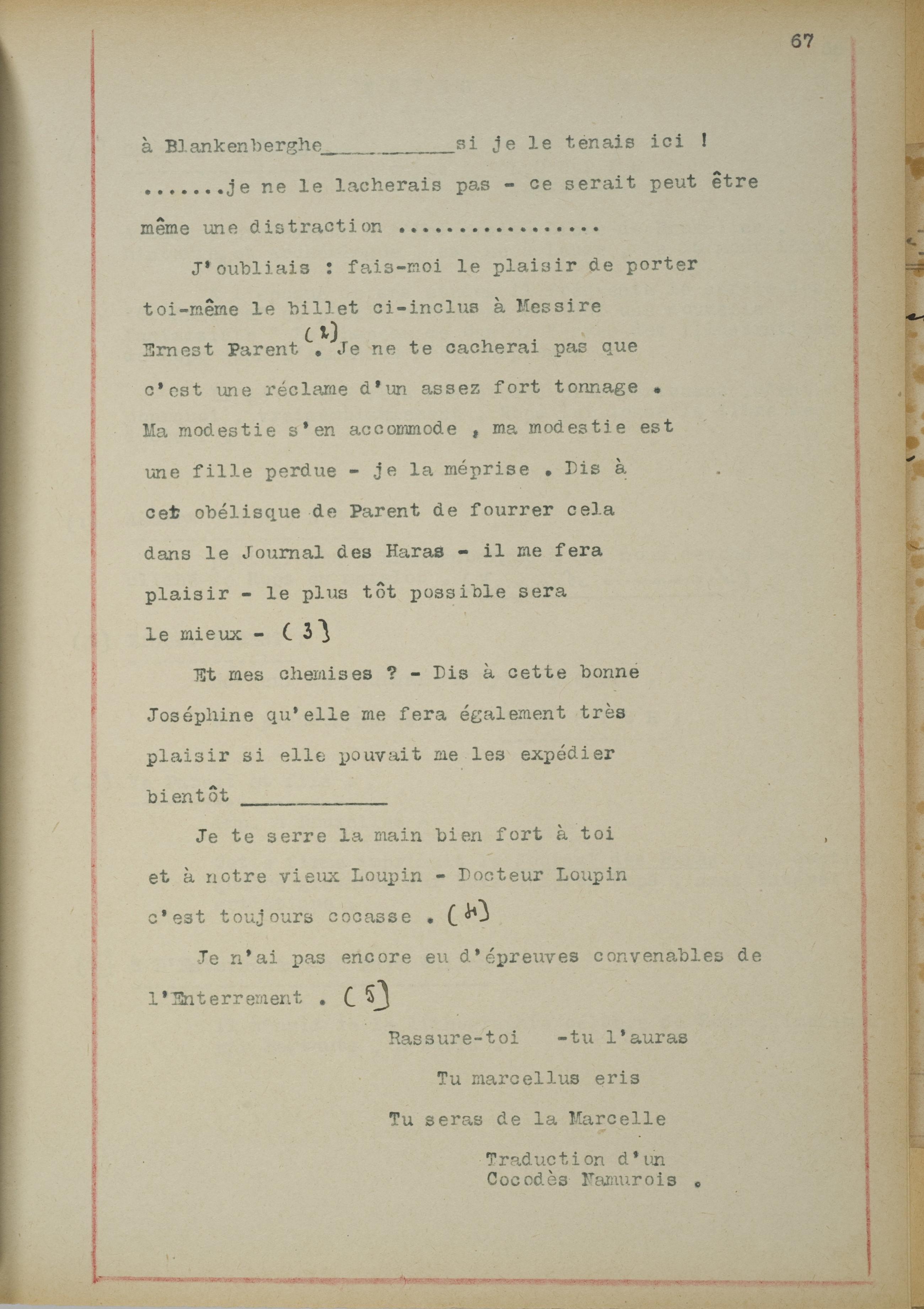 J’oubliais : fais-moi le plaisir de porter toi-même le billet ci-inclus à Messire Ernest Parent. Je ne te cacherai pas que c’est une réclame d’un assez fort tonnage. Ma modestie s’en accommode, ma modestie est une fille perdue – je la méprise. Dis à cet obélisque de parent de fourrer cela dans le Journal des Haras – il me fera le plaisir – le plus tôt possible sera le mieux –