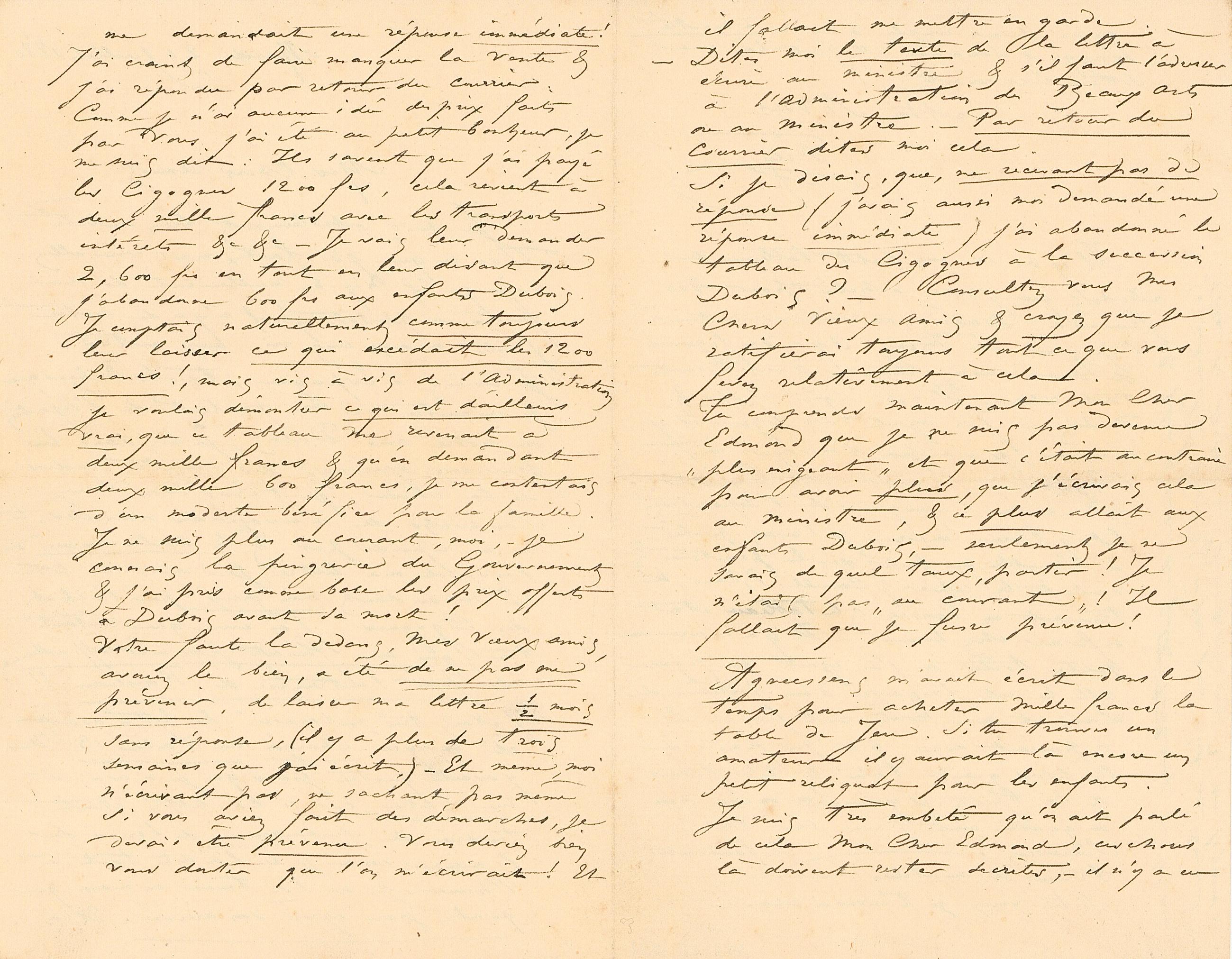me demandait une réponse immédiate ! J’ai craint de faire manquer la vente & j’ai répondu par retour du courrier. Comme je n’ai aucune idée des prix faits par vous j’ai été au petit bonheur, je me suis dit : Ils savent que j’ai payé les Cigognes 1200 frs, cela revient à deux mille francs avec les transports intérêts &c &c – Je vais leur demander 2,600 frs en tout en leur disant que j’abandonne 600 frs aux enfants Dubois. Je comptais naturellement comme toujours leur laisser ce qui excédait les 1200 francs !, mais vis à vis de l’Administration je voulais démontrer ce qui est d’ailleurs vrai, que ce tableau me revenait à deux mille francs & qu’en demandant deux mille 600 francs, je me contentais d’un modeste bénéfice pour la famille. Je ne suis plus au courant, moi, – je connais la pingrerie du Gouvernement & j’ai pris comme base les prix offerts à Dubois avant sa mort !
