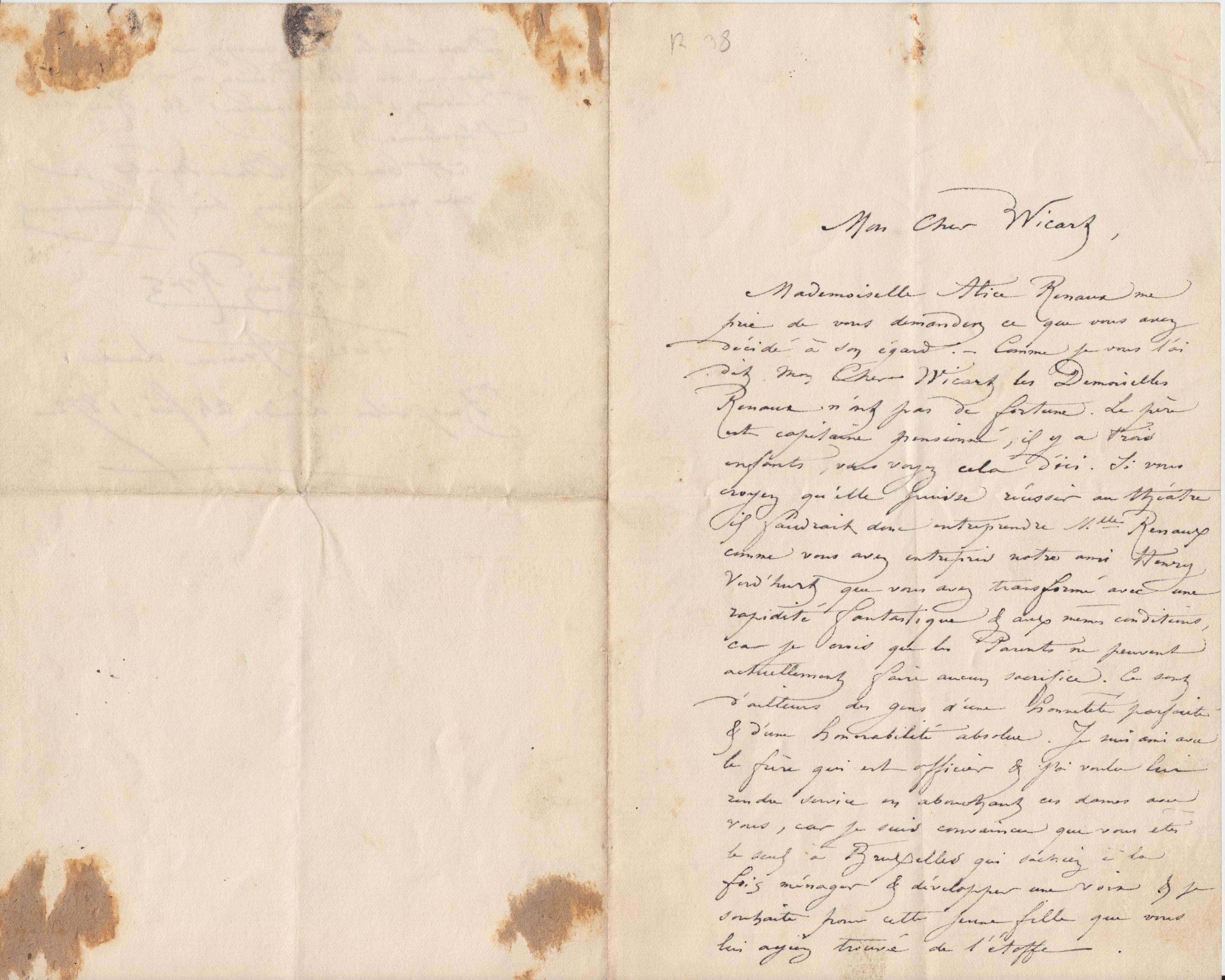 Mademoiselle Alice Renaux me prie de vous demander ce que vous avez décidé à son égard. – Comme je vous l’ai dit mon Cher Wicartles Demoiselles Renaux n’ont pas de fortune. Le père est capitaine pensionné, il y a trois enfants, vous voyez cela d’ici. Si vous croyez qu’elle puisse réussir au théâtre il faudrait donc entreprendre Mlle Renaux comme vous avez entrepris notre ami Henry Verd’hurt que vous avez transformé avec une rapidité fantastique & aux mêmes conditions, car je crois que les Parents ne peuvent actuellement faire aucun sacrifice. Ce sont d’ailleurs des gens d’une honnêteté parfaite et d’une honorabilité absolue. Je suis ami avec le frère qui est officier & j’ai voulu lui rendre service en abouchant ces dames avec vous, car je suis convaincu que vous êtes le seul à Bruxelles qui sachiez à la fois ménager & développer une voix & je souhaite pour cette jeune fille que vous lui ayiez trouvé de l’étoffe.