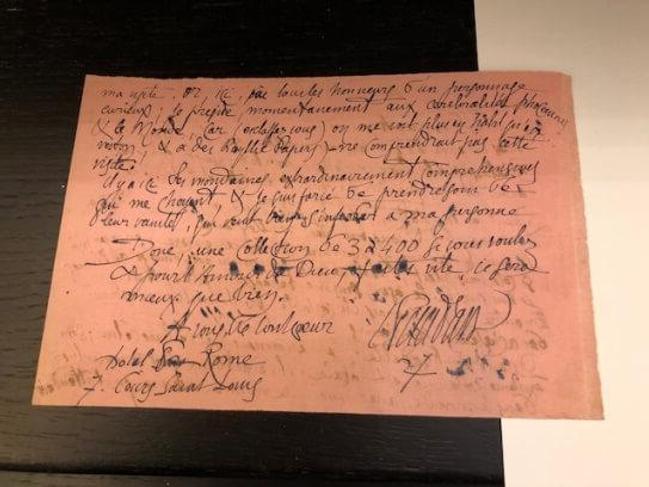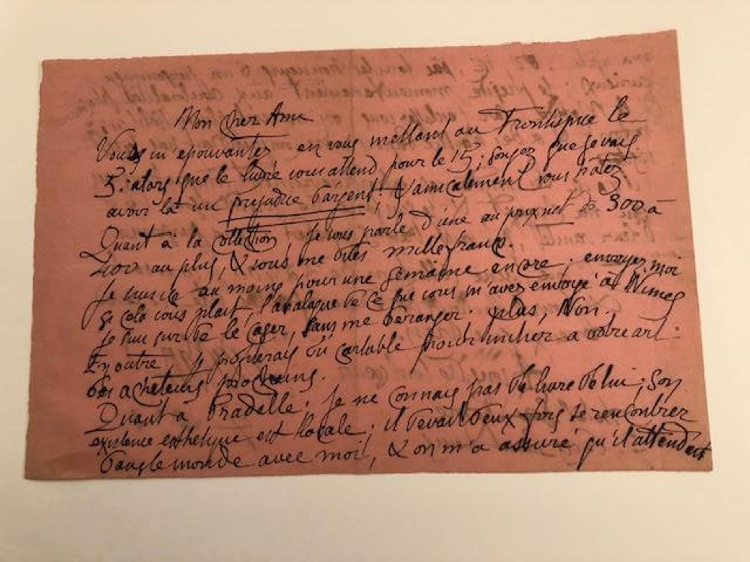 Je [illisible] au moins pour une semaine encore ; envoyez-moi si cela vous plait, l’analogue de ce que je vous avais envoyé à Nîmes, je suis sûr de la caser, sans me déranger ; plus, non. En outre, je profiterais du cartable pour initier à votre art des acheteurs prochains.