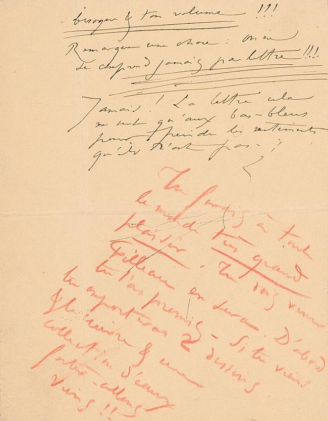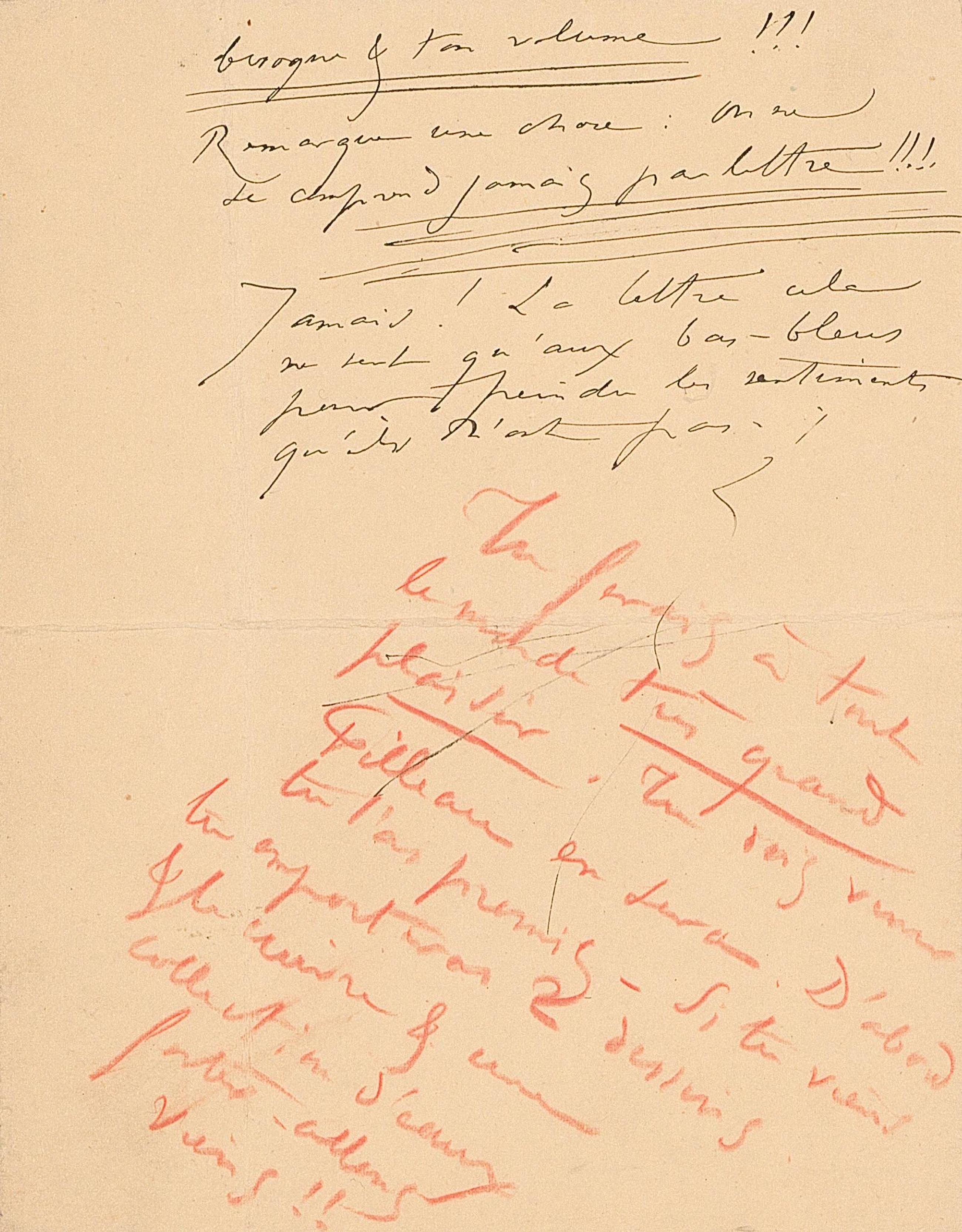 besogne & ton volume !!! Remarque une chose : On ne se comprend jamais par lettre !!!. Jamais ! La lettre cela ne sert qu’aux bas-bleus pour peindre les sentiments qu’ils n’ont pas !